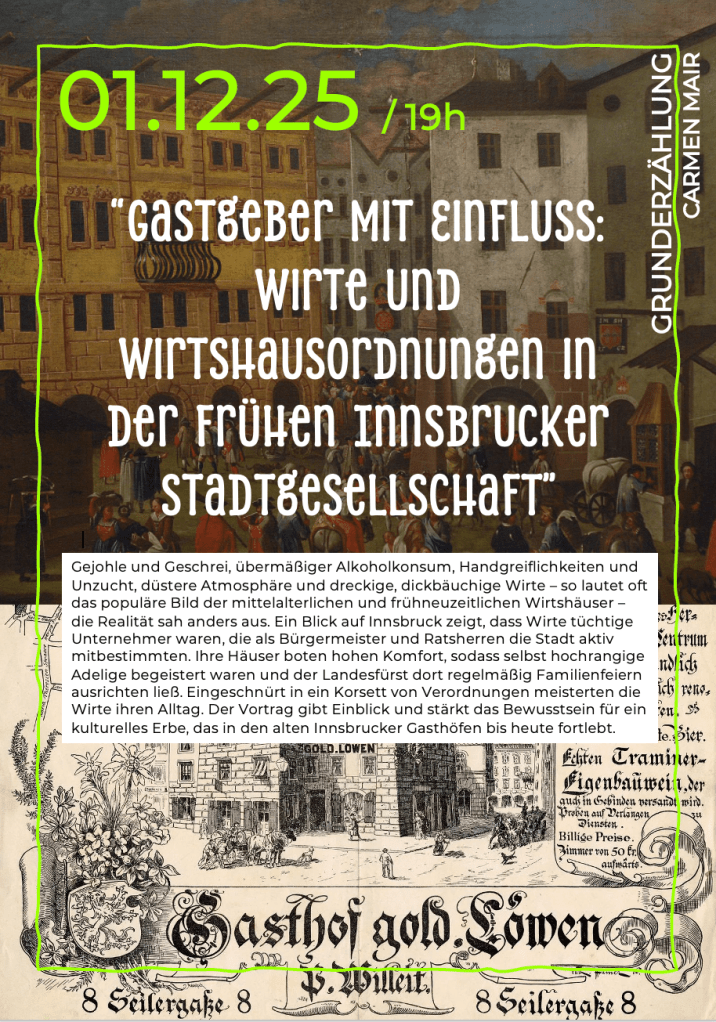 Gejohle und Geschrei, übermäßiger Alkoholkonsum, Handgreiflichkeiten und Unzucht, düstere Atmosphäre und dreckige, dickbäuchige Wirte – so lautet oft das populäre Bild der mittelalterlichen und frühneuzeitlichen Wirtshäuser. Doch die Realität sah anders aus. Ein Blick auf Innsbruck zeigt, dass Wirte geschäftstüchtige Unternehmer waren, die als Bürgermeister und Ratsherren die Stadt aktiv mitbestimmten. Ihre Häuser boten hohen Komfort, sodass selbst hochrangige Adelige begeistert waren und der Landesfürst dort regelmäßig Familienfeiern ausrichten ließ. Eingeschnürt in ein Korsett von Verordnungen mussten die Wirte zwischen Kontrolle, wirtschaftlichem Auskommen und Prestige ihren Alltag meistern. Der Vortrag gibt Einblick und stärkt das Bewusstsein für ein kulturelles Erbe, das in den alten Gasthöfen bis heute fortlebt.