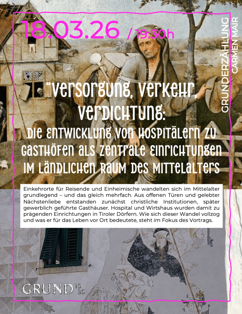 Einkehrorte für Reisende und Einheimische wandelten sich im Mittelalter grundlegend – und das gleich mehrfach. Aus offenen Türen und gelebter Nächstenliebe entstanden zunächst christliche Institutionen, später gewerblich geführte Gasthäuser. Hospital und Wirtshaus wurden damit zu prägenden Einrichtungen in Tiroler Dörfern. Wie sich dieser Wandel vollzog und was er für das Leben vor Ort bedeutete, steht im Fokus des Vortrags.