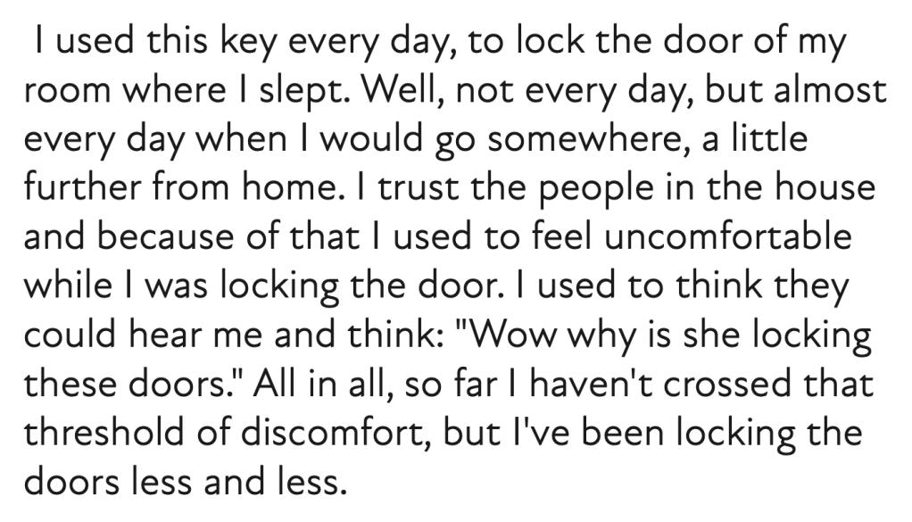 It’s not just about taking good care of the property. There is no lock that can resist absolute violence, and all locks are invitations to thieves. The lock is a psychological threshold.“